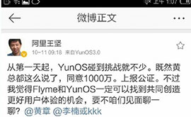 近日,黃章發(fā)表言論稱好的手機也要配合好的手機系統(tǒng),言下之意是將與之合作的阿里YunOS 3.0 系統(tǒng)無法與其MX4匹配,還是自家Flyme才配得上MX4。隨后阿里巴巴YunOS事業(yè)部總經理@阿里元寶 反擊稱YunOS 3.0 的體驗度完全不比使用Android的Flyme差,甚至愿意個人拿出20W做賭注,誓要將YunOS 3.0與Flyme一較高下。