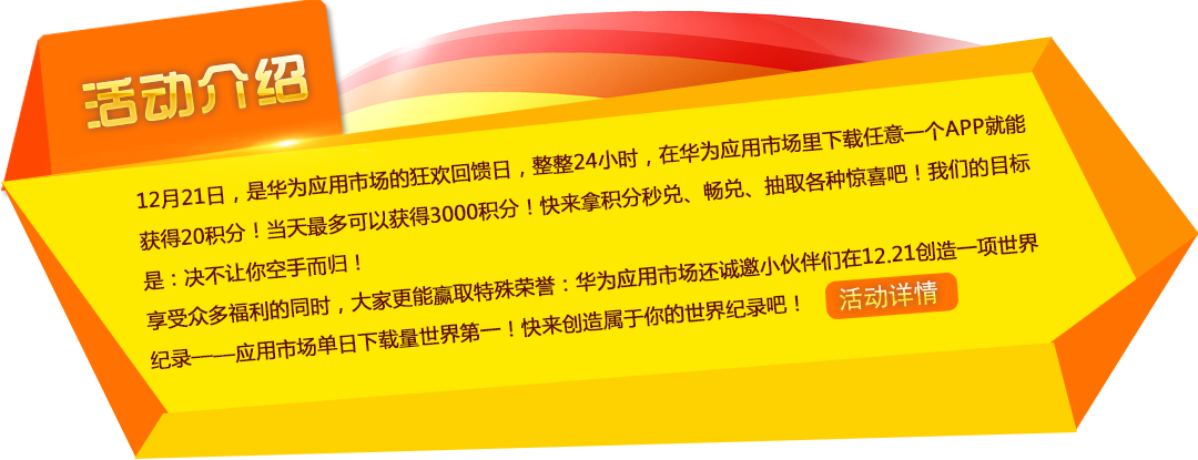 華為應(yīng)用市場作為國內(nèi)擁有過億用戶的下載平臺之一,在2013年于業(yè)內(nèi)首推“一觸即發(fā) 下載必獎”概念后,今年再次拋出大手筆——2014年的12月21日,你不僅可以在華為應(yīng)用市場下載到各種熱門的APP,還能開走你心中的奔馳GLA SUV,更有機會與百萬“熟悉的陌生人”一起創(chuàng)造下載平臺單日下載量的世界紀(jì)錄!
