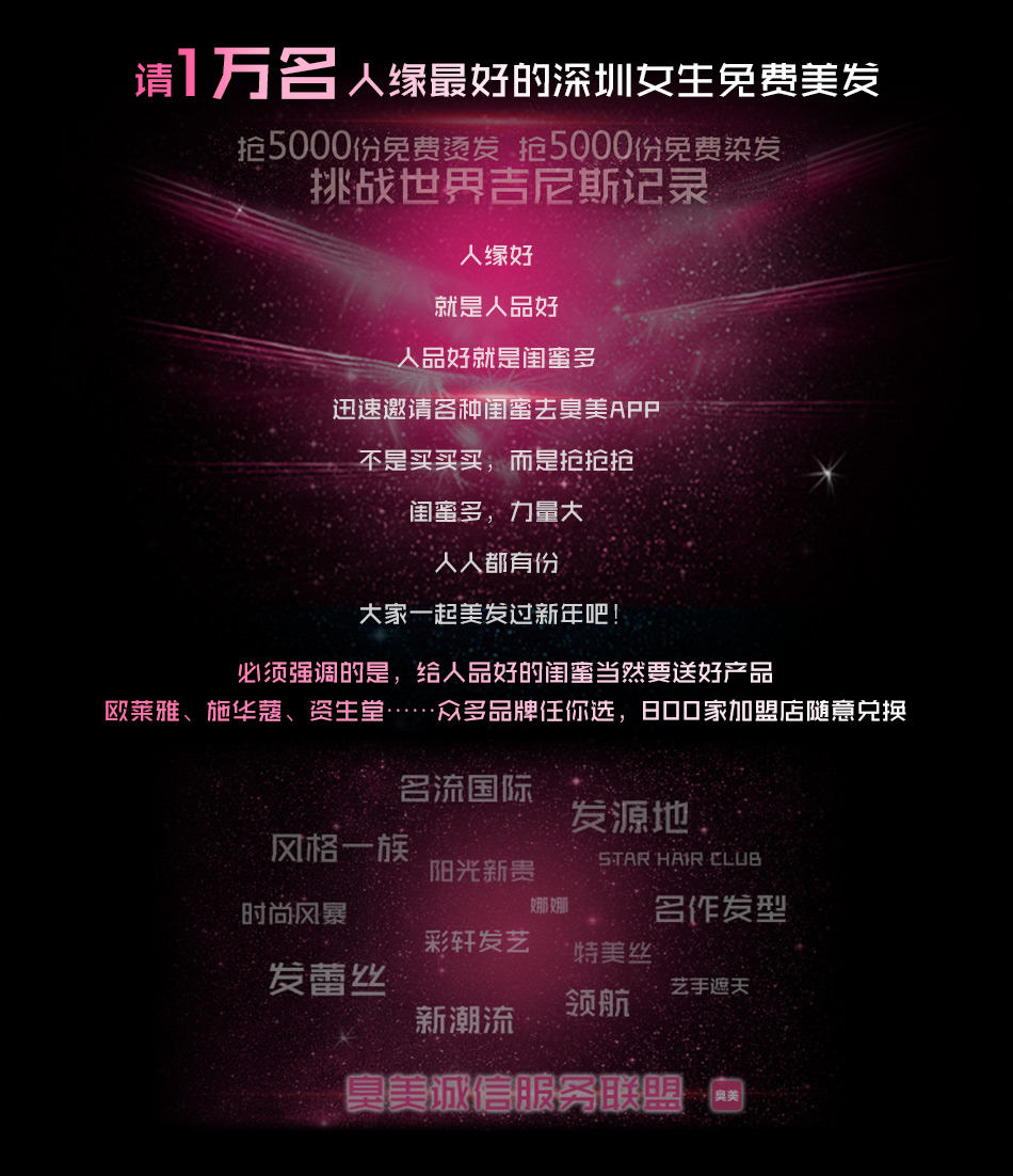 當(dāng)時鐘從2014年跳到了2015年,有多少人對著天空許下了從頭開始的愿望?現(xiàn)在,正有一個 從“頭”開始的機會,擺在你的面前,這就是由知名美容美發(fā)行業(yè)O2O領(lǐng)導(dǎo)品牌“臭美美發(fā)”所發(fā)起的2015深圳“臭美之夜”首屆美發(fā)節(jié)活動。